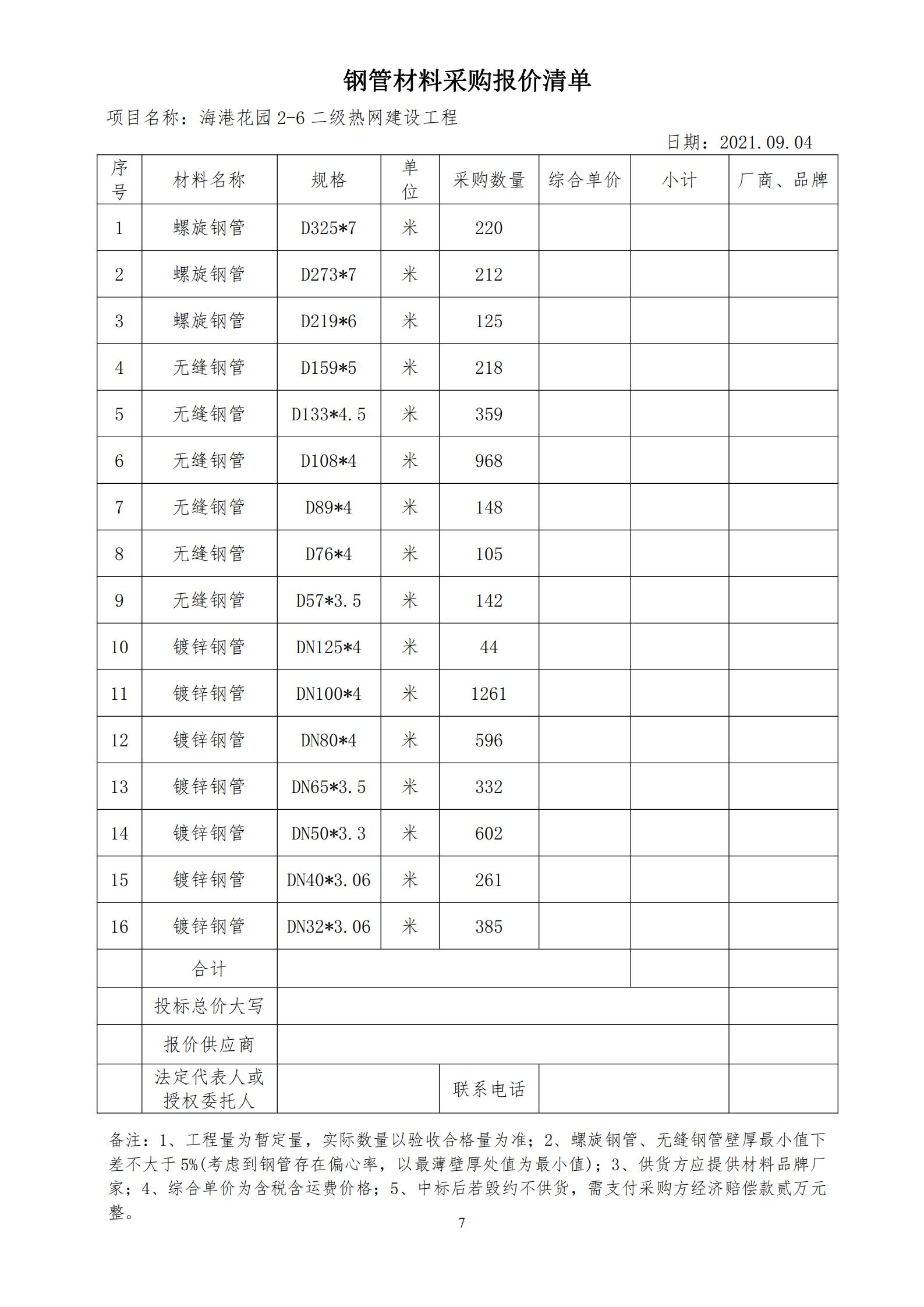 1.材料采購內(nèi)容:海港花園2-6二級熱網(wǎng)建設(shè)工程用鋼管,具體規(guī)格要求、數(shù)量詳見材料報價清單。