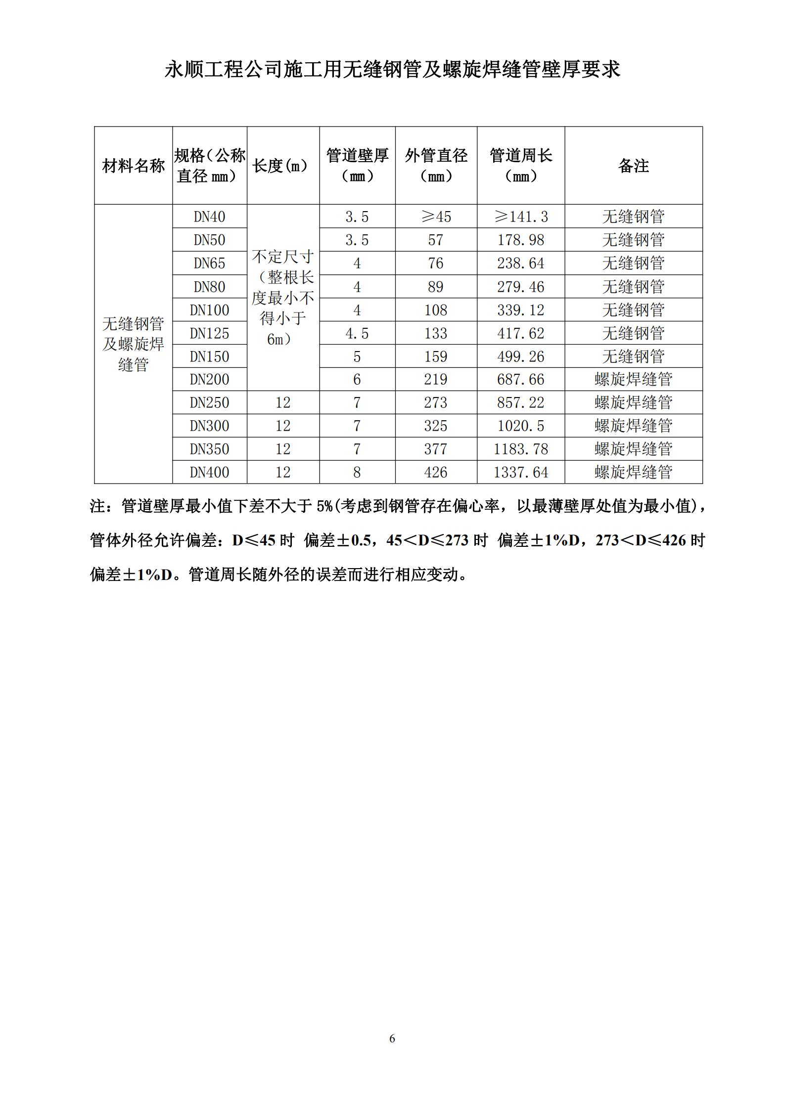 ①無縫鋼管:采取20#鋼,標準為GB/T17395-2008《無縫鋼管尺寸、外形、重量及運行偏差》、GB/8163《輸送流體用無縫鋼管》;螺旋鋼管:材質(zhì)為Q235B,標準為GB/T 9711-2017。無縫鋼管及螺旋鋼管壁厚最小值下差不大于5%,(考慮到鋼管存在偏心率,以最薄壁厚處值為最小值)且不得低于以下企業(yè)標準:上海寶鋼集團公司、首鋼集團、鞍山鋼鐵集團公司、武漢鋼鐵(集團)公司、萊蕪鋼鐵集團、濟南鋼鐵集團總公司、攀枝花鋼鐵(集團)公司、唐山鋼鐵集團有限責(zé)任公司、青島鋼鐵控股集團有限責(zé)任公司、天津鋼管集團有限公司。
