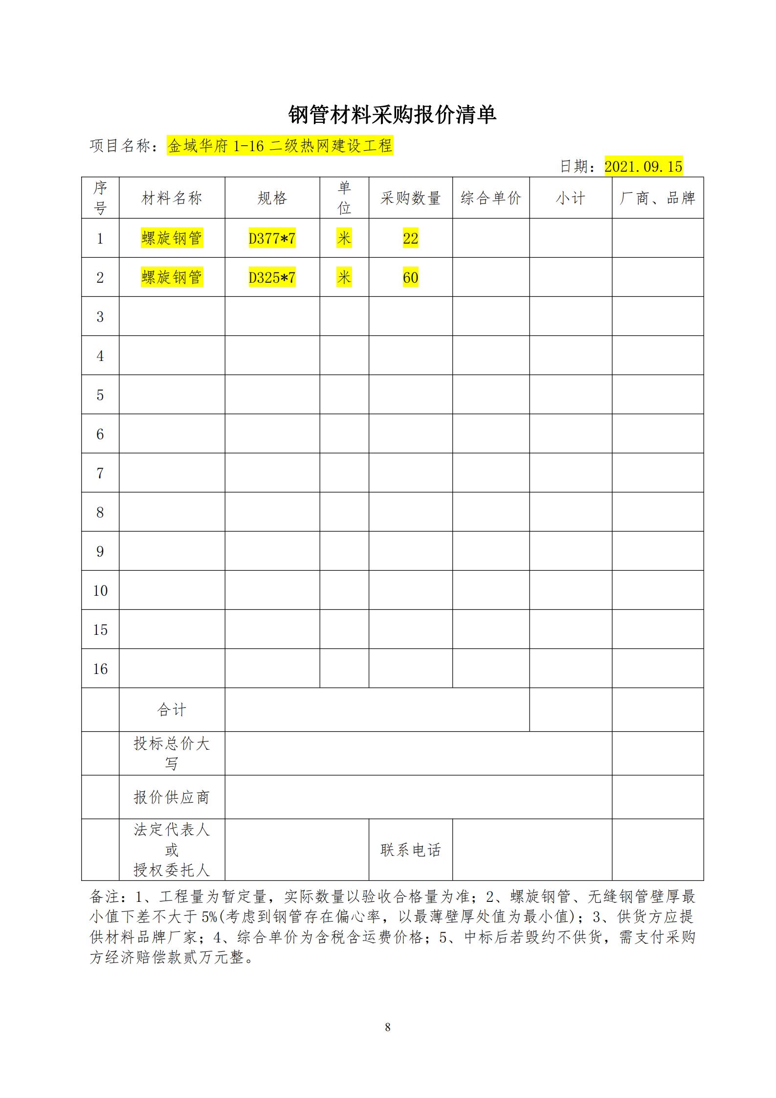 1.材料采購(gòu)內(nèi)容:金域華府1-16二級(jí)熱網(wǎng)建設(shè)工程用鋼管,具體規(guī)格要求、數(shù)量詳見材料報(bào)價(jià)清單。